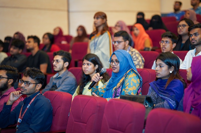 The session began with remarks from Md. Farhan Faruqui, Faculty of Business Administration, East West University. This was followed by a speech from special guest Dr. A. K. Enamul Haque, Director General, Bangladesh Institute of Development Studies (BIDS). Next, Md. Iqbal Hussain, Additional Secretary (Administration Wing), Ministry of Youth and Sports, addressed the audience with his insightful thoughts. The speeches continued with the Chief Guest, Dr. Anisuzzaman Chowdhury, Special Assistant to the Chief Advisor (State Minister Rank), Ministry of Finance, Government of the People’s Republic of Bangladesh, who shared his inspiring words. Finally, the Chair of the session, Professor Shams Rahman, Vice Chancellor, East West University, delivered his speech, highlighting the significance of youth participation in policy making. To conclude, Professor Dr. Mohammad Ashik Mosaddik, Pro