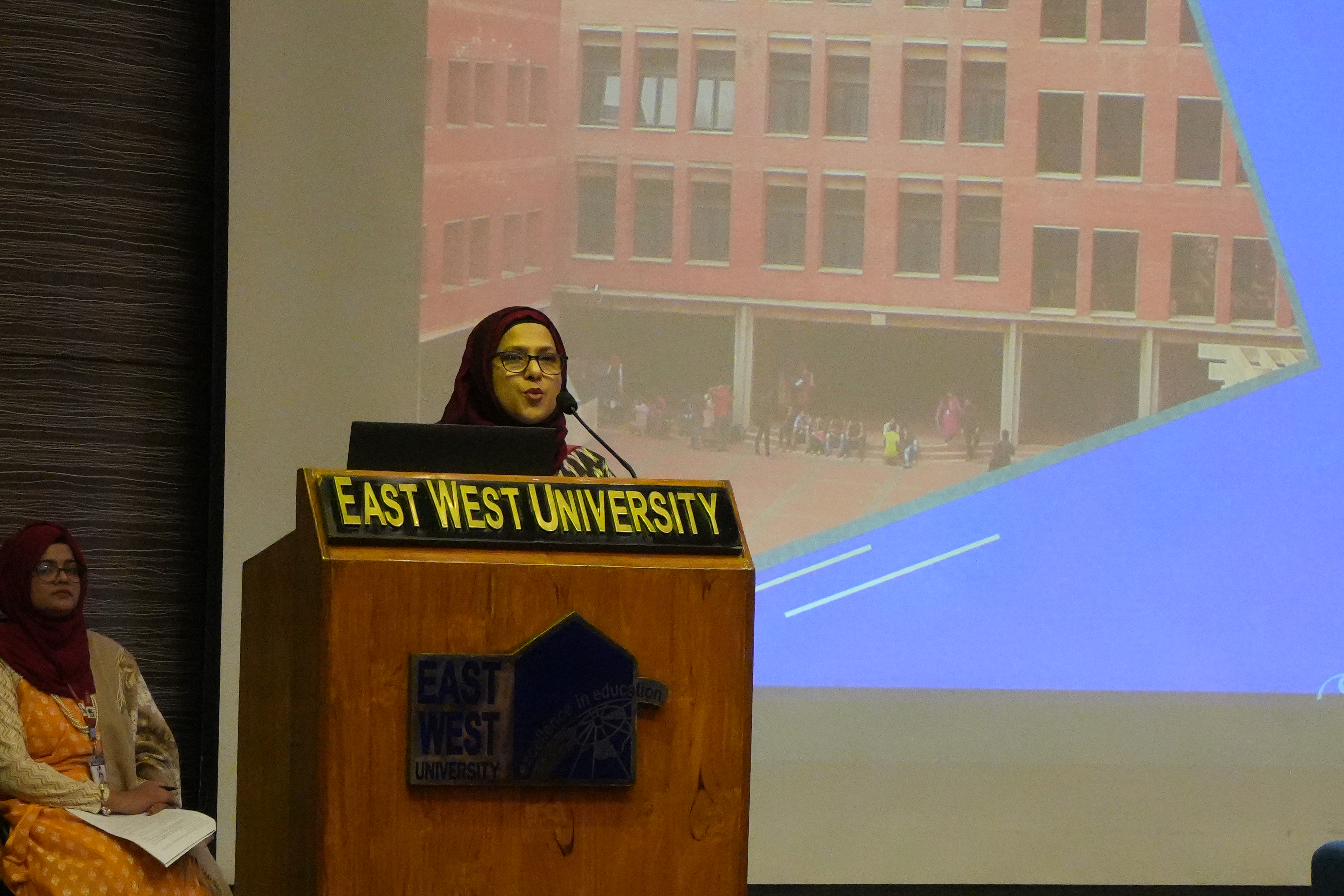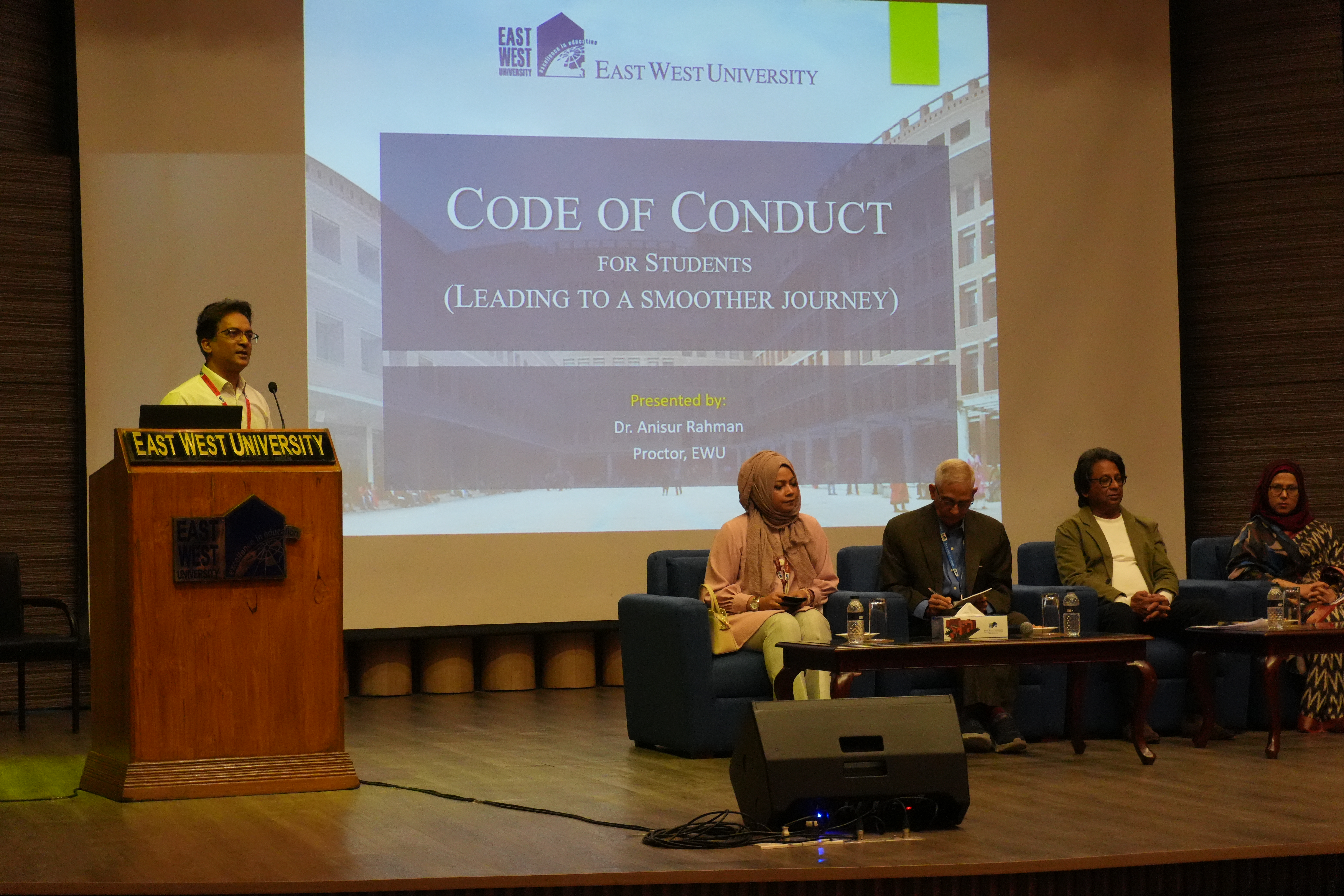 The first session was dedicated to students from the Faculty of Business & Economics and the Faculty of Liberal Arts & Social Sciences. The program began with an informative presentation on the Department of Students Welfare (DSW) & Career Counseling Center by Ms. Ismat Shereen, Adviser of DSW. Professor Dr. Farzana Akhter, Dean of the Faculty of Liberal Arts & Social Sciences, and Professor Dr. Farhana Ferdousi, Chairperson of the Department of Business Administration, delivered remarks welcoming the students and highlighting the academic standards they are expected to uphold. To ensure students are well-versed in university regulations and safety, Dr. Anisur Rahman, Proctor of EWU and Associate Professor of the Department of Computer Science & Engineering, presented the ‘EWU Code of Conduct.’ This was followed by a crucial session on the ‘EWU Sexual Harassment Elimination & Prevention Policy’ conducted by Dr. Fouzia Mannan, Chairperson and Professor of the Department of Sociology. Recognizing the importance of holistic well-being, Mr. Md. Rukonuzzaman, Socio-Psyche Counsellor, shared insights on mental health awareness. The afternoon session was held for the newcomers of the Faculty of Science and Engineering. While the core components of the program remained the same, Professor Dr. Ahmed Wasif Reza, Dean of the Faculty of Sciences & Engineering, addressed the students, welcoming them to the technical and scientific community of the university.
