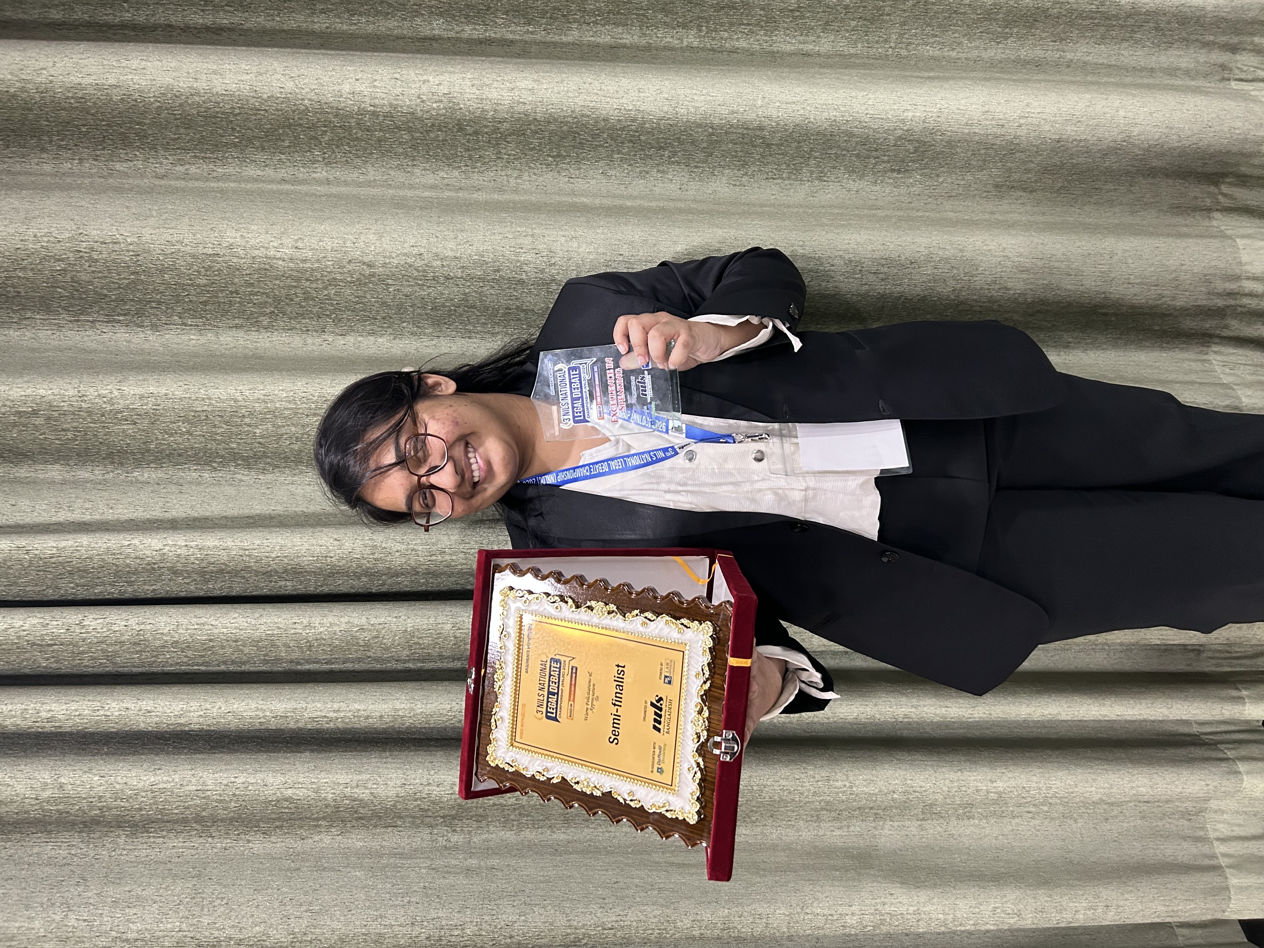The Department of Law of East West University was represented by four teams in the competition. Among them, two teams demonstrated commendable performance against strong national-level competitors. Out of a total of 32 teams representing 22 universities across the country, one team from the Department of Law advanced to the semi-final round, marking a significant achievement in a highly competitive debating environment. The Semi-Finalist Team named ‘Verdict Vault’ consisted of Md. Salmun Alam, Abdur Rahman Jobair, and Shagufta Chowdhury Adrita. Md. Salmun Alam, serving as both the Prime Minister and the Opposition Leader, played a pivotal role throughout the tournament. He demonstrated exceptional analytical ability and presence of mind, particularly in rebuttal and sur-rebuttal. His skill in identifying logical gaps, responding to opposing arguments in real time, and reinforcing the team’s core stance significantly strengthened the team’s performance in every round. As the Assistant Prime Minister, Abdur Rahman Jobair delivered strong, well-structured constructive speeches that formed the foundation of the team’s case. His clear articulation, sound legal reasoning, and persuasive delivery provided a solid framework upon which rebuttals and extensions were effectively built. Shagufta Chowdhury Adrita, acting as the Government Whip, delivered impactful speeches by synthesizing arguments. Her outstanding performance earned her the prestigious Best Speaker Award.