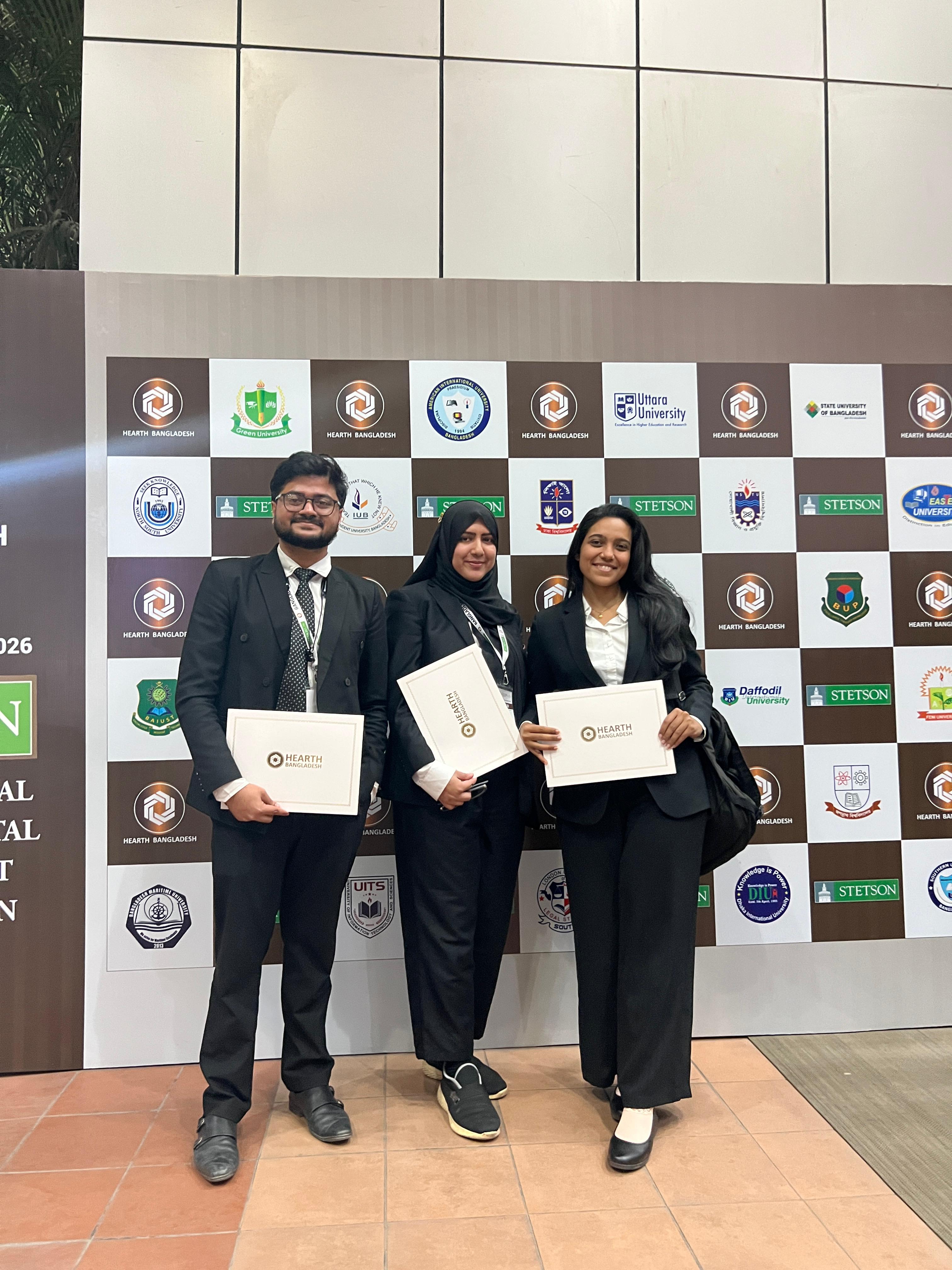 The Department of Law of East West University is delighted to share the success of its team of undergraduate students who represented EWU at the 2nd Bangladesh Qualifying Rounds of the Stetson International Environmental Moot Court Competition 2025–2026 held on February 5-7, 2026, at the Independent University Bangladesh co-organized by Independent University and Hearth Bangladesh. The team from the Department of Law successfully advanced to the Semi-Finals, securing a position among the top four teams in the competition. The team comprised Saima Haque (First Oralist), Israt Jahan Sadia (Second Oralist), and Mahidul Hasan (Researcher). Through consistent dedication, rigorous legal research, and confident oral advocacy, they delivered an outstanding performance throughout the qualifying rounds. The team was ably guided and mentored by their Coach, Shah Maruf Uddin Ahmad, and Co-Coach, Shaikh Mirazur Rahman, both Lecturers in Law, whose continuous support, strategic insight, and encouragement were instrumental to this success. The Department warmly congratulates the team on this remarkable achievement and wishes them continued success in their future academic and professional endeavors.