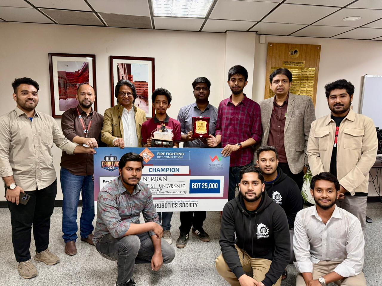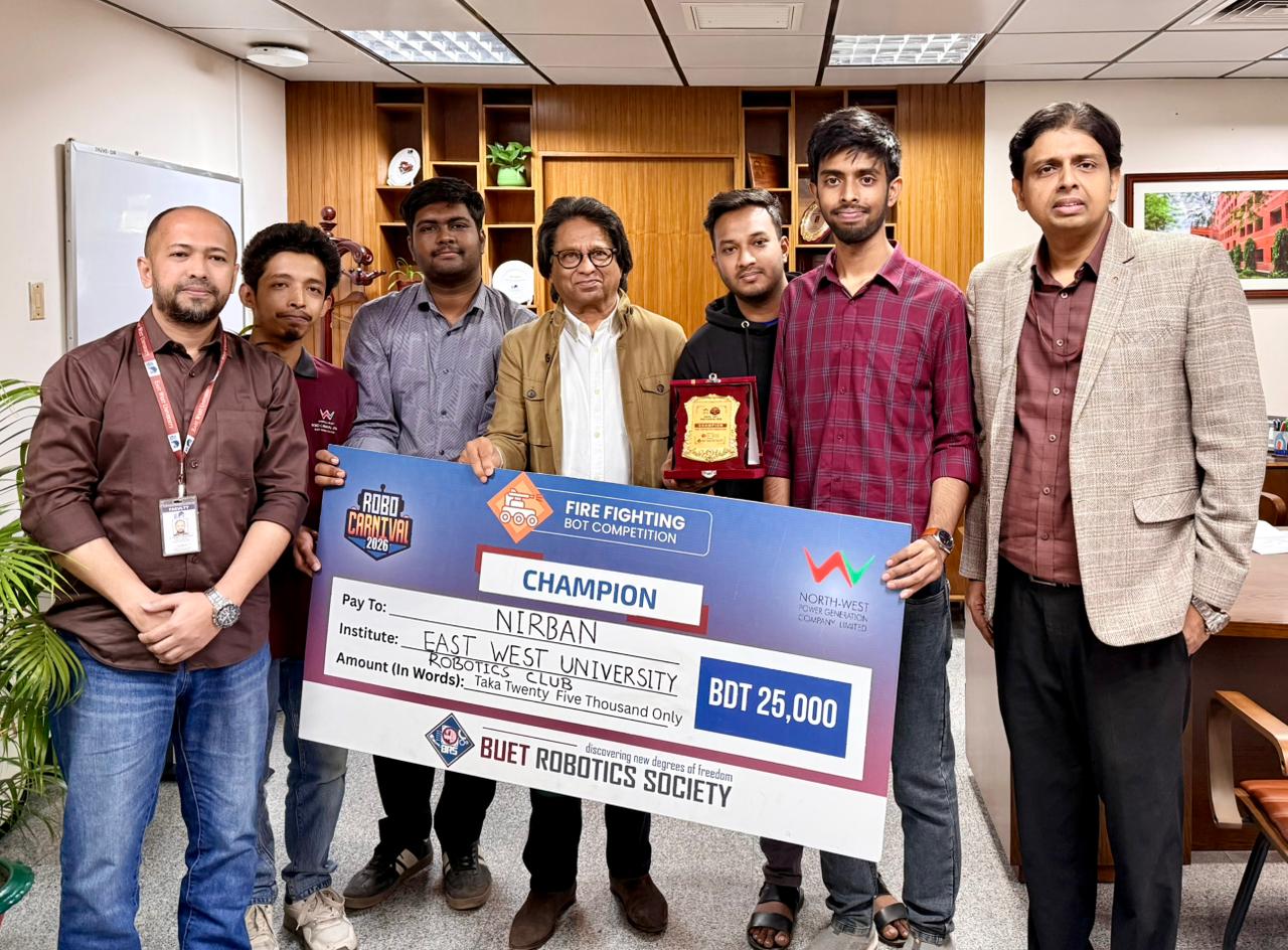 East West University (EWU) has once again demonstrated its excellence in robotics and technical innovation. Team “Nirban,” representing the EWU Robotics Club, secured the prestigious Championship Title in the "Fire Fighting Bot" contest at the National Robo Carnival 2026, held at the Bangladesh University of Engineering and Technology (BUET) from February 5–6, 2026