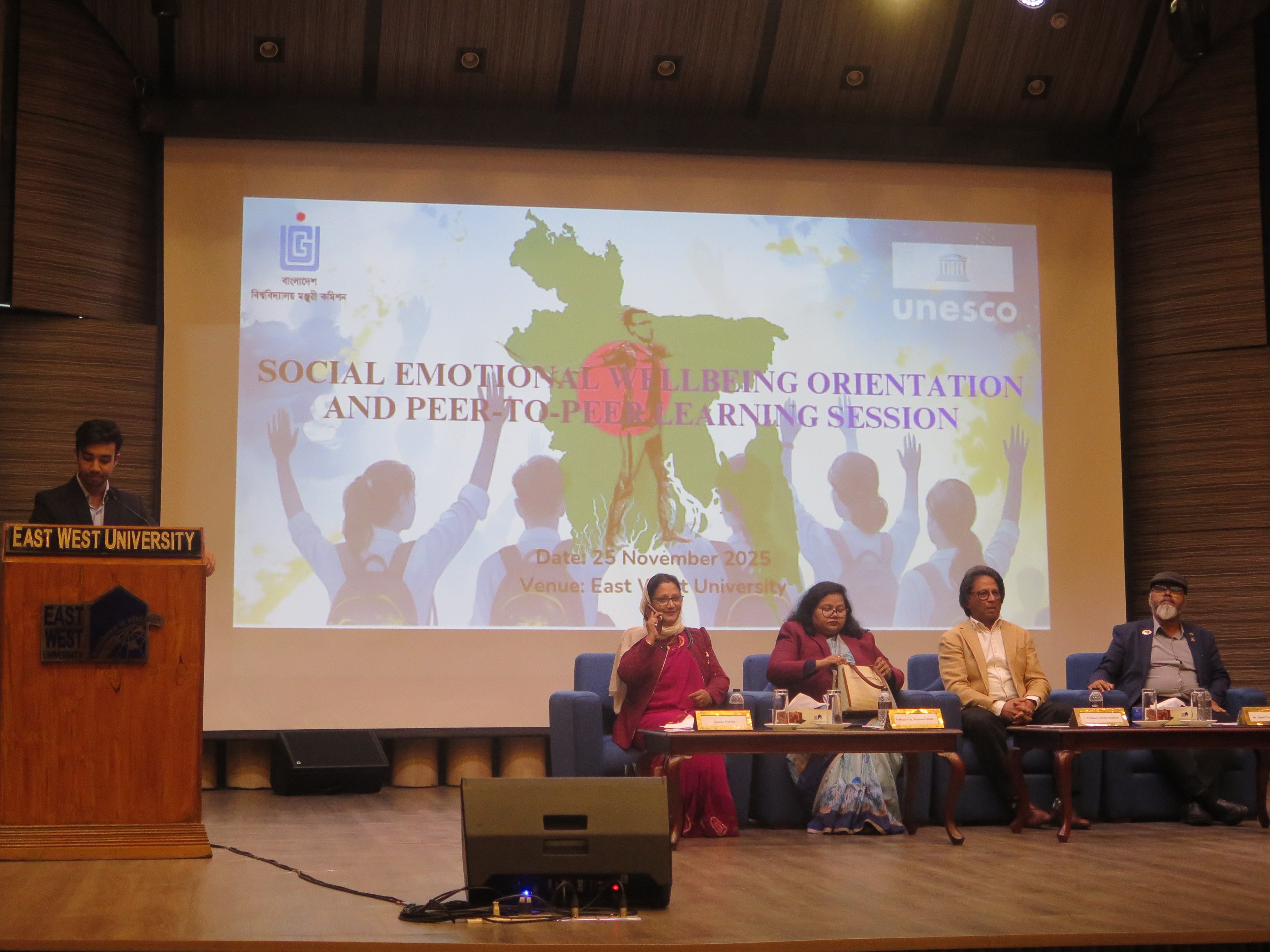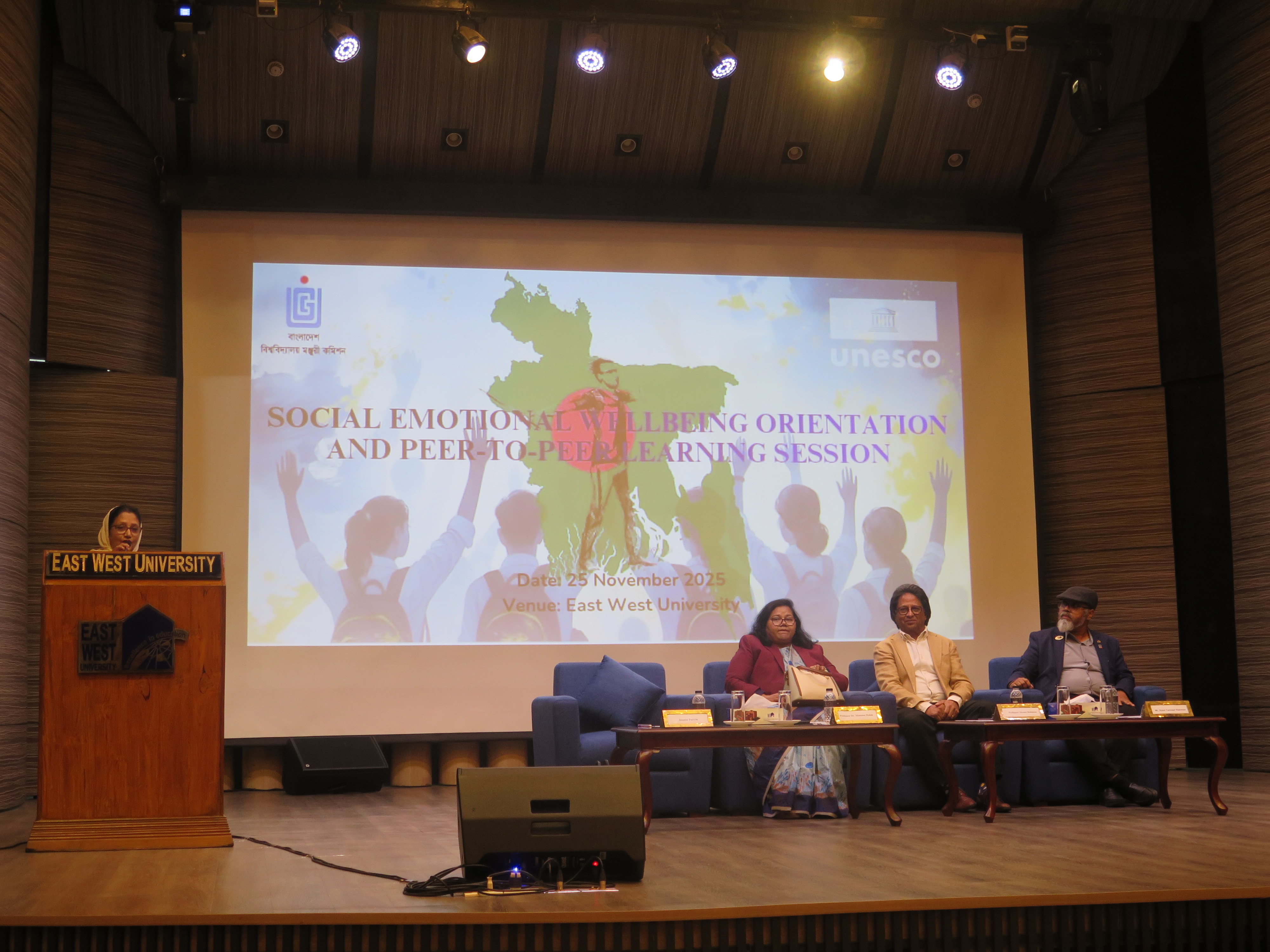 The department of Students’ Welfare of East West University (EWU) hosted a vital "Peer-to-Peer Orientation Learning Session on Social Emotional Well-being" on November 25, 2025, at the Manzur Elahi Auditorium. The program was organized by the University Grants Commission (UGC) of Bangladesh, in collaboration with UNESCO. The session was designed to equip students with the necessary skills to manage academic pressures, enhance mental resilience, and build effective support networks among their peers.