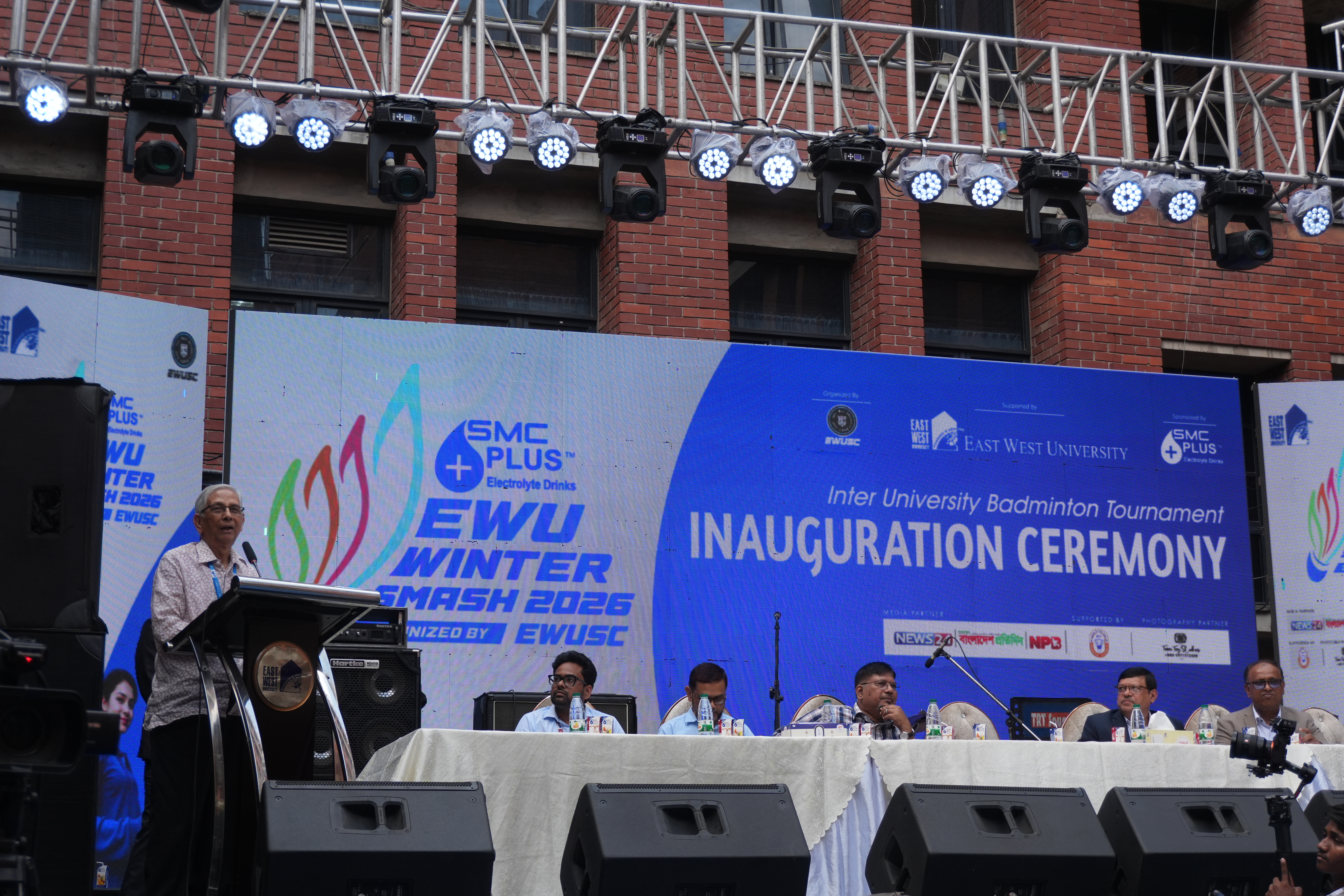On 05 April 2026, the grand Inauguration Ceremony of SMC Plus Electrolyte Drink EWU Winter Smash 2026, organized by the East West University Sports Club, marked a vibrant and a memorable beginning of the event. The ceremony was held at the courtyard of East West University and honored by the presence of the following distinguished personalities: Professor Dr. Mohammed Farashuddin, Chairperson, Board of Trustees, East West University (EWU), as the Chief Guest, along with Professor Dr. Md. Ashik Mosaddik, Pro Vice-Chancellor, EWU, Mr. Toslim Uddin Khan, Managing Director & CEO, SMC Enterprise Ltd, Mr. Abul Bashir Khan, FCMA, CFO, SMC Enterprise Ltd., Md. Ismail Hossain, Brand Manager, SMC Plus, Ishmat Shereen, Advisor, Students’ Welfare and Head of CCC, EWU, Professor Dr. Md. Mobarak Hossain Khan, Moderator, EWU Sports Club, and Abdur Rahaman Sumon, Moderator, EWU Sports Club.