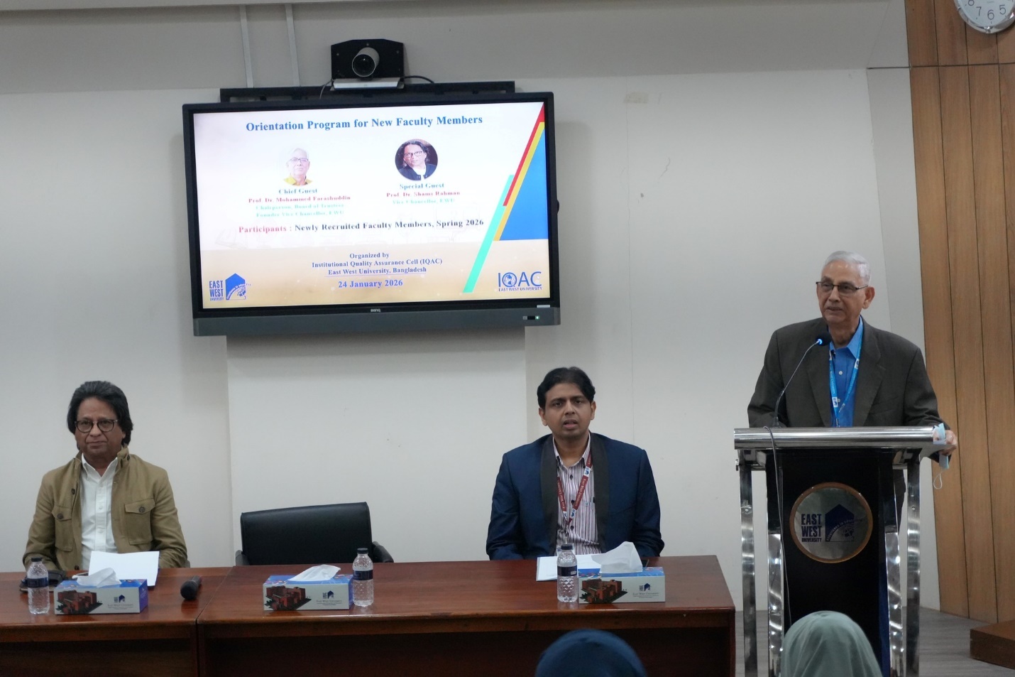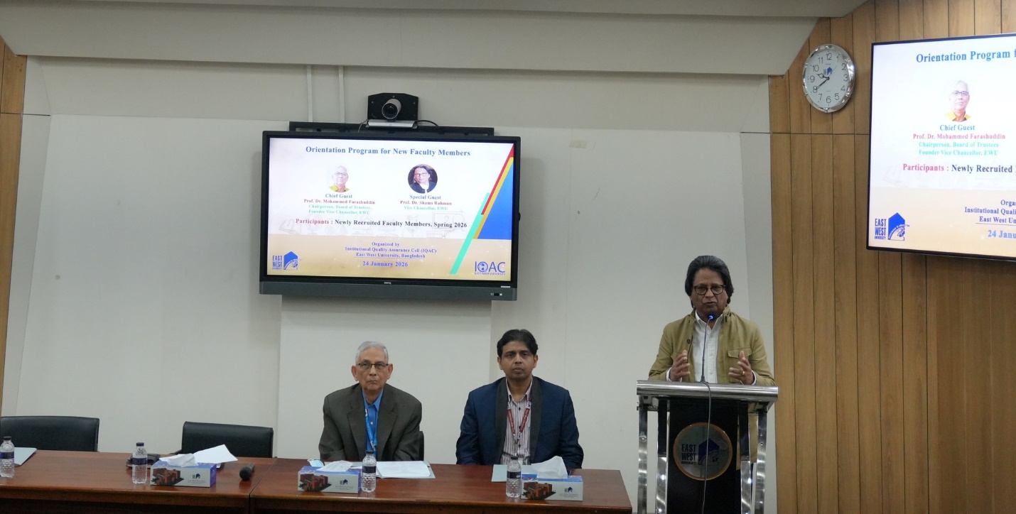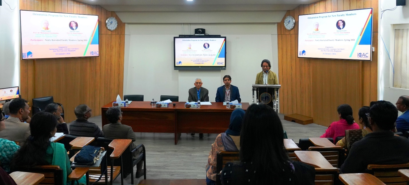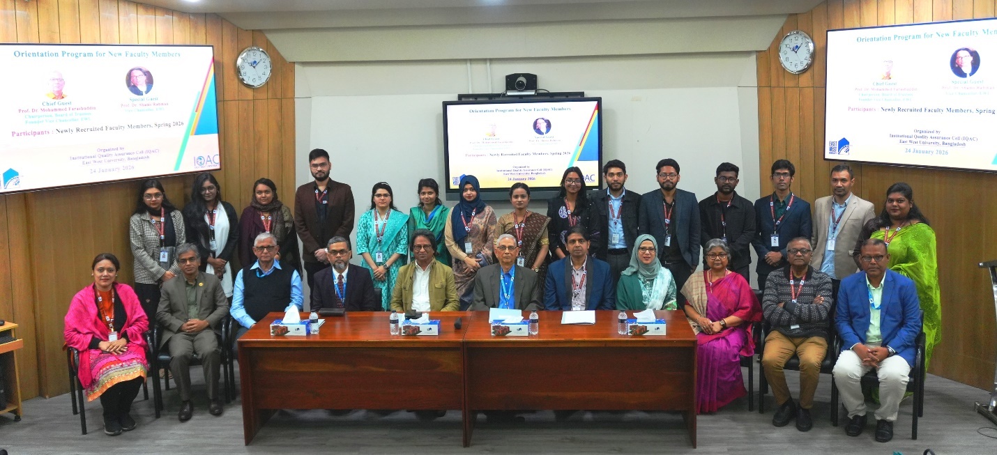 The Institutional Quality Assurance Cell (IQAC) of East West University (EWU) organized a day-long Orientation Program on 24 January 2026 for the newly recruited faculty members who joined during the Spring 2026 semester. Professor Dr. Mohammed Farashuddin, Chairperson, Board of Trustees, EWU and Founder Vice Chancellor, EWU attended the inaugural ceremony as the chief guest, while Professor Dr. Shams Rahman, Vice Chancellor of EWU present as the special guest.