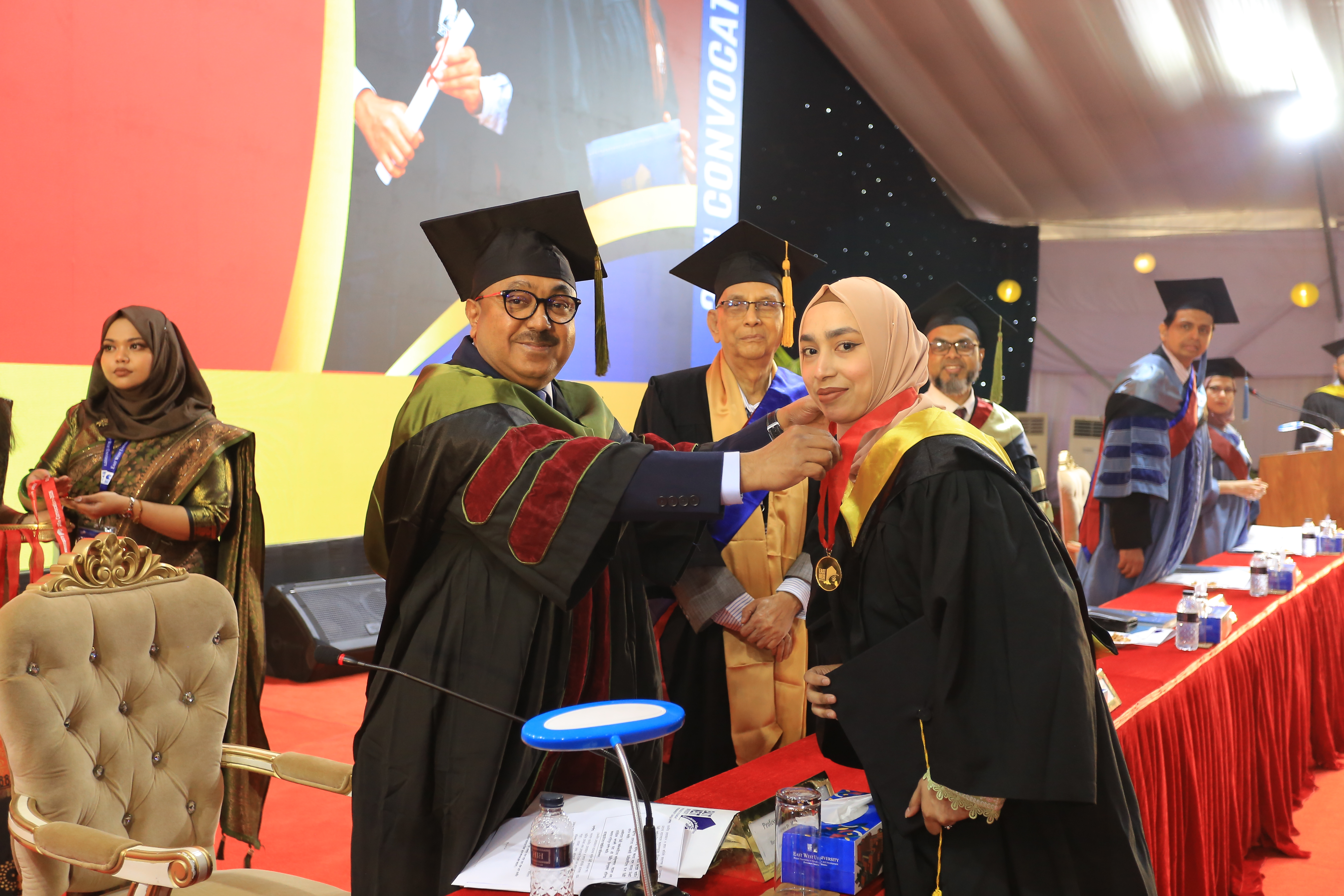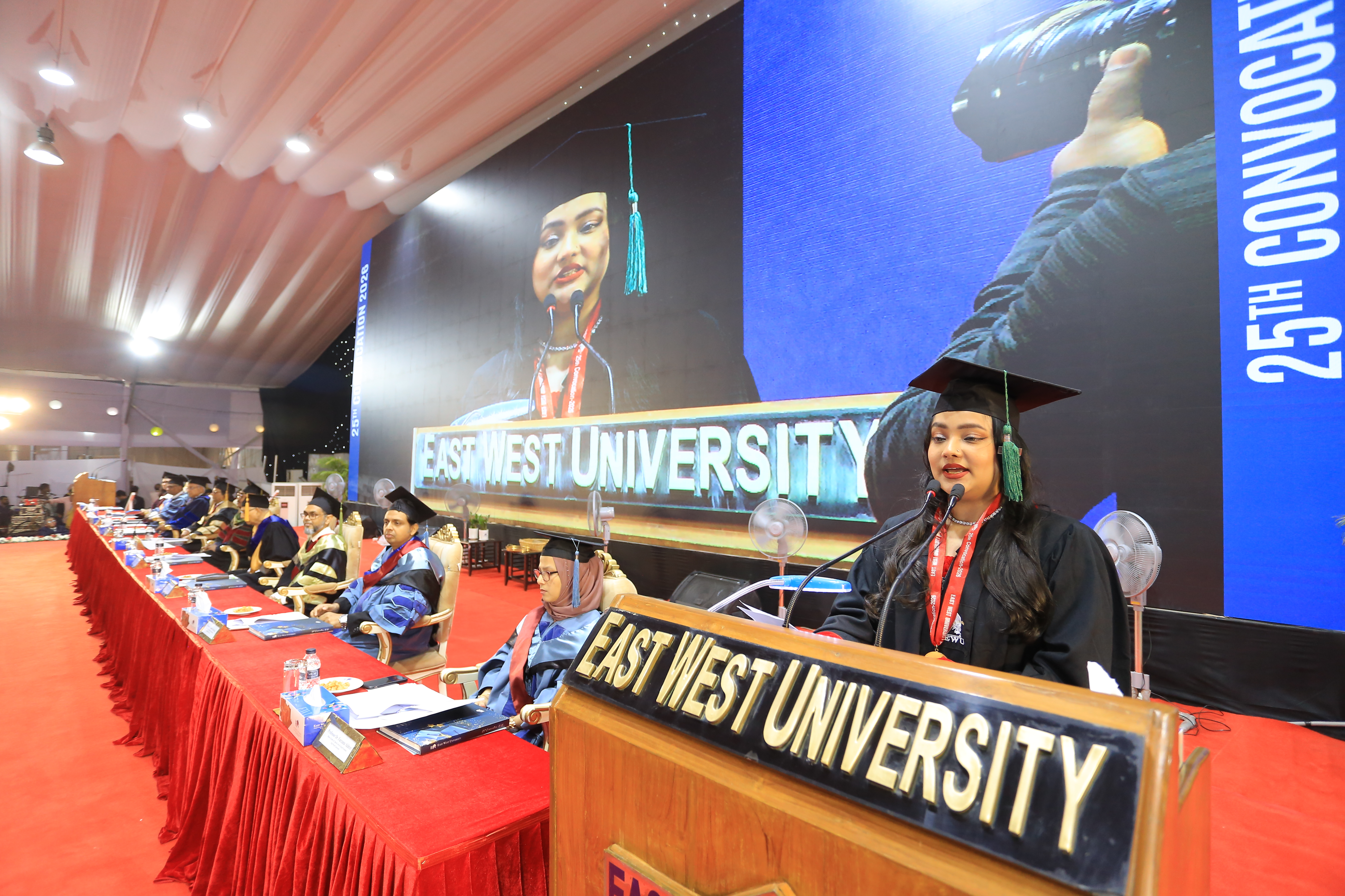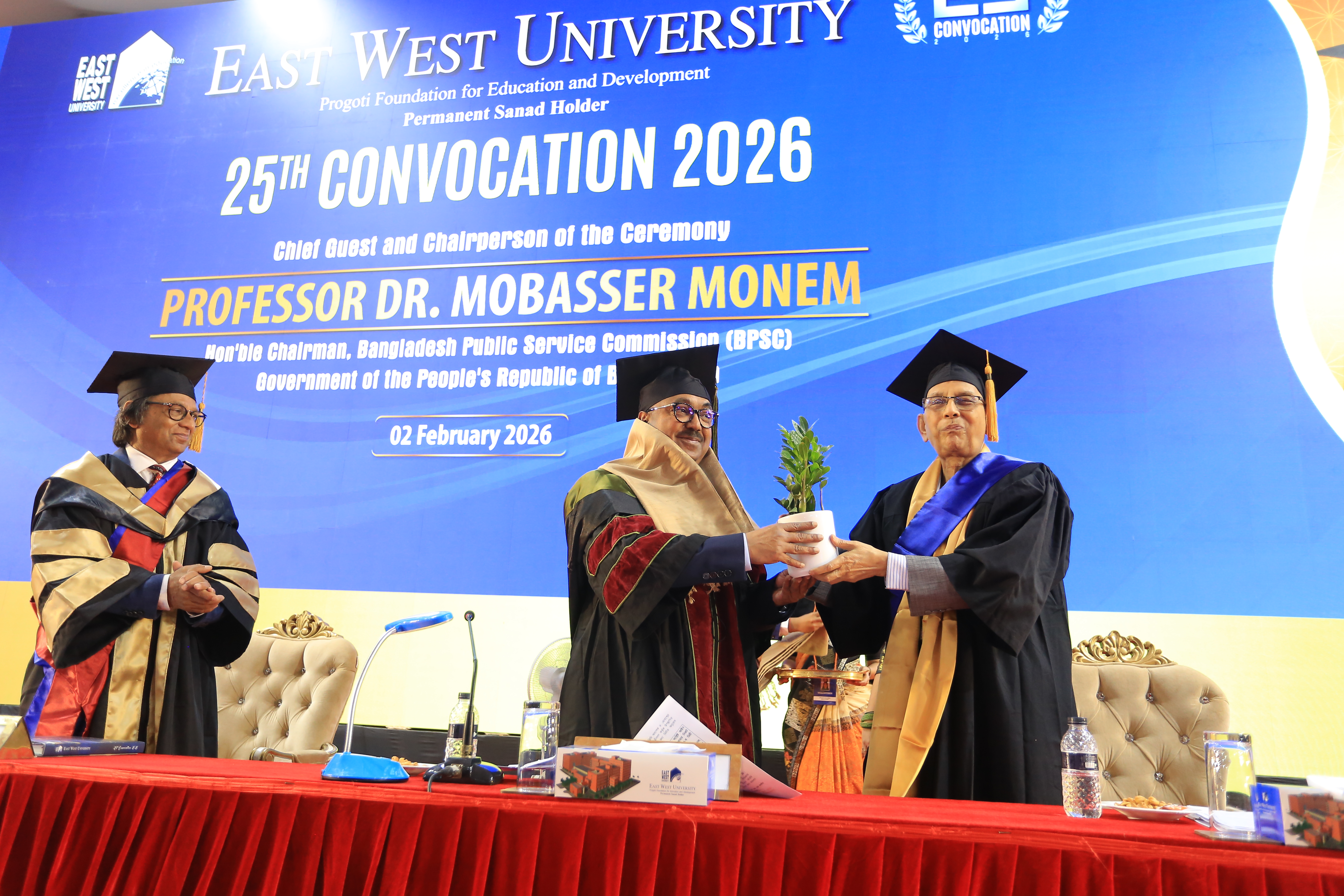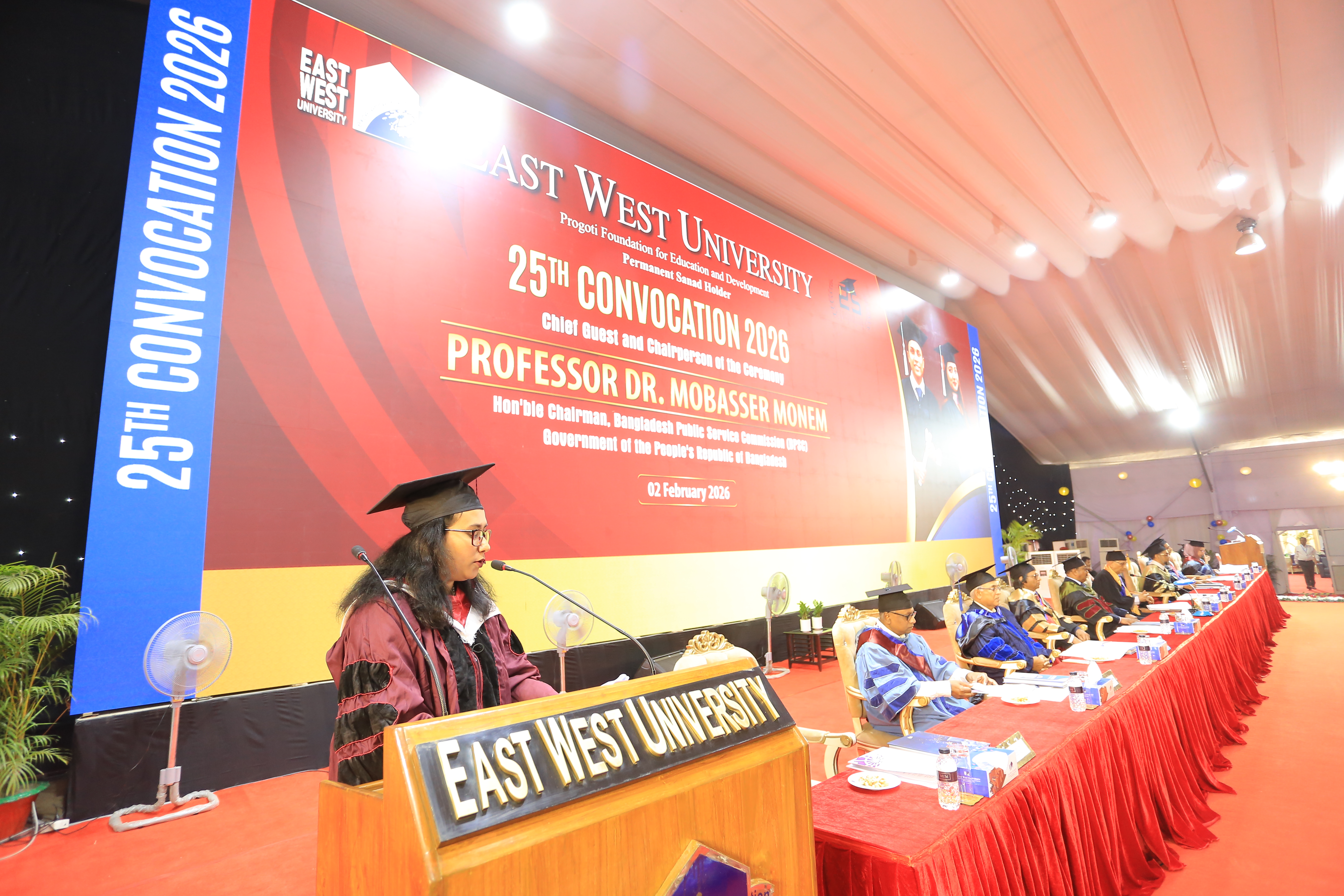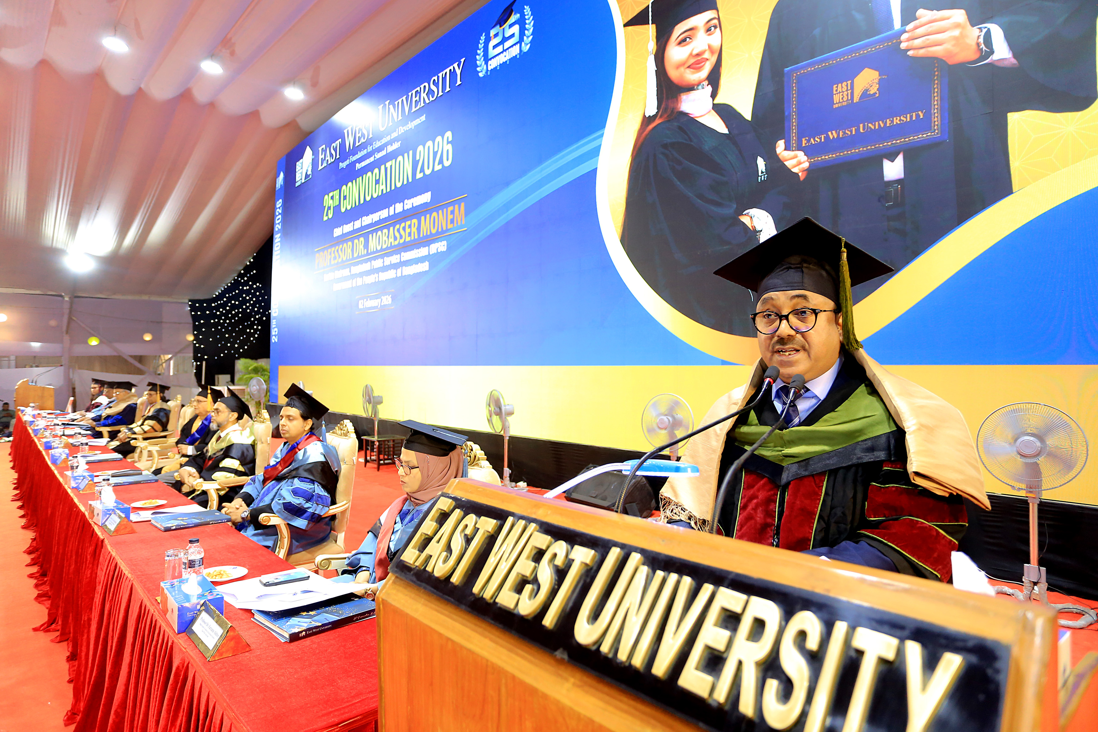 The 25th convocation of East West University (EWU) was held on 02 February 2026 (Monday) at Aftabnagar Playground in the capital. At the convocation, as the representative of His Excellency the President, the Chancellor of the university, Professor Dr. Mobasser Monem, Chairman of Bangladesh Public Service Commission (BPSC), presented degrees to the students. 1857 students of undergraduate and graduate programs were awarded certificates at this convocation. In addition, nine exceptionally meritorious students with a CGPA of 4.0 out of 4.0 were awarded gold medals.