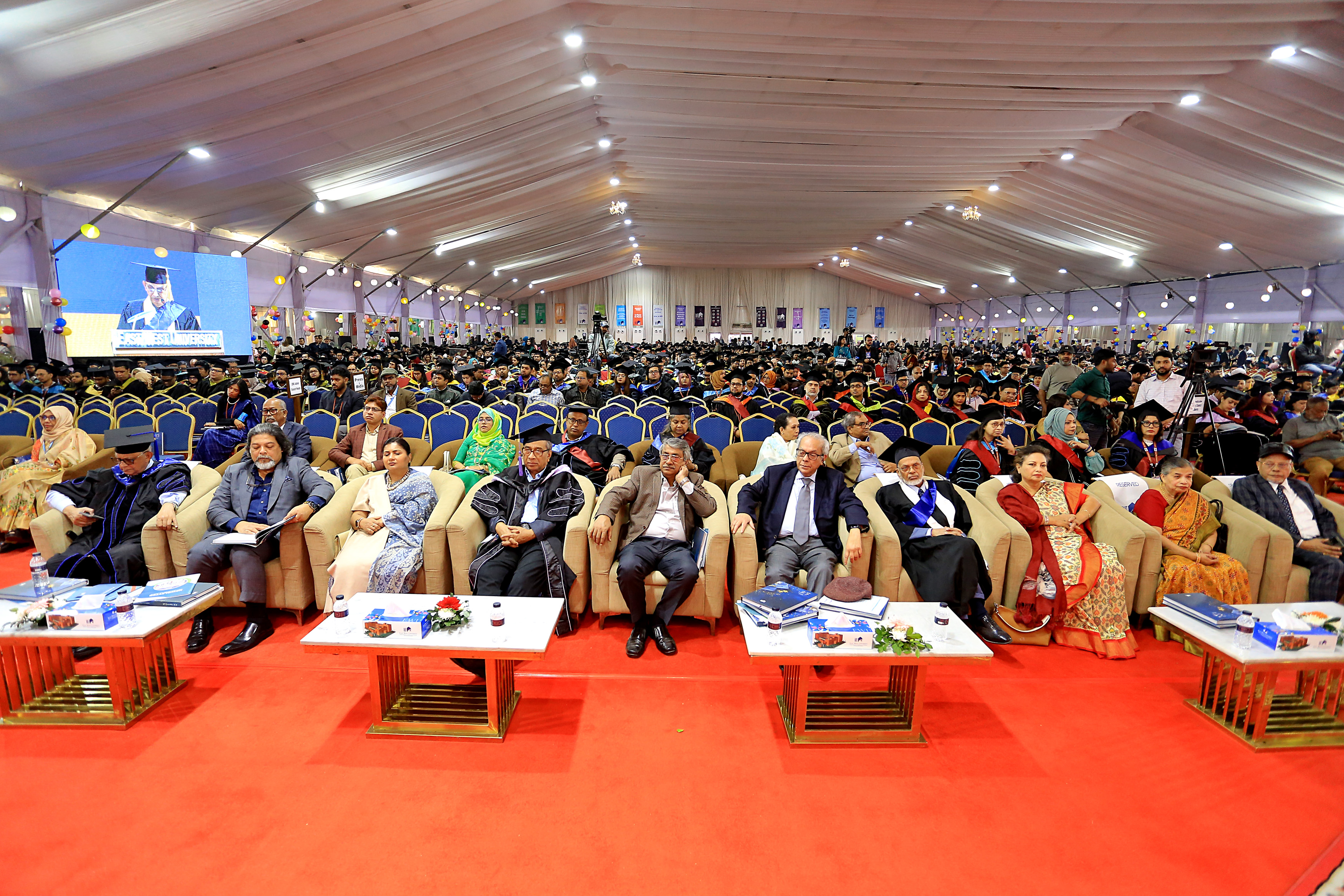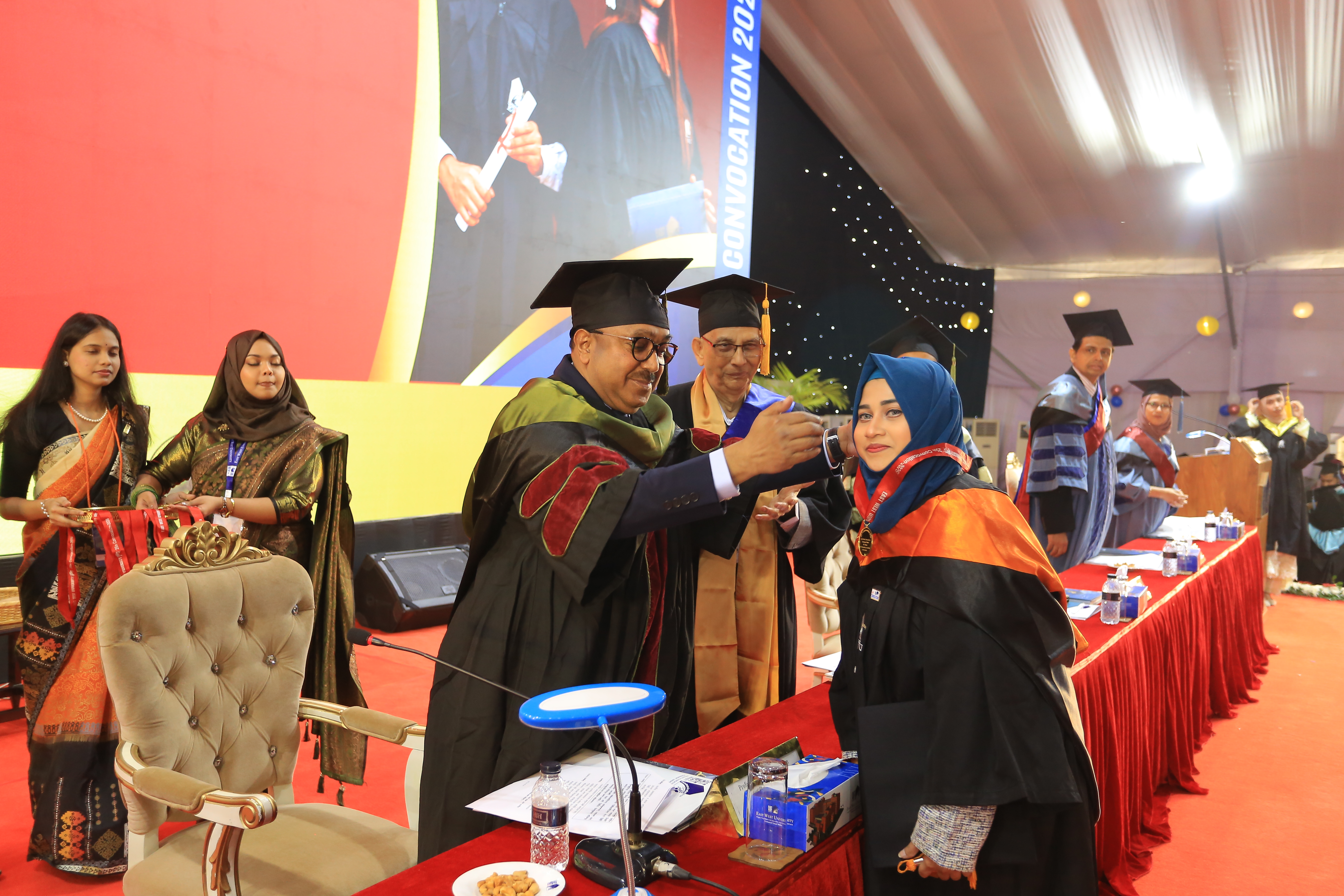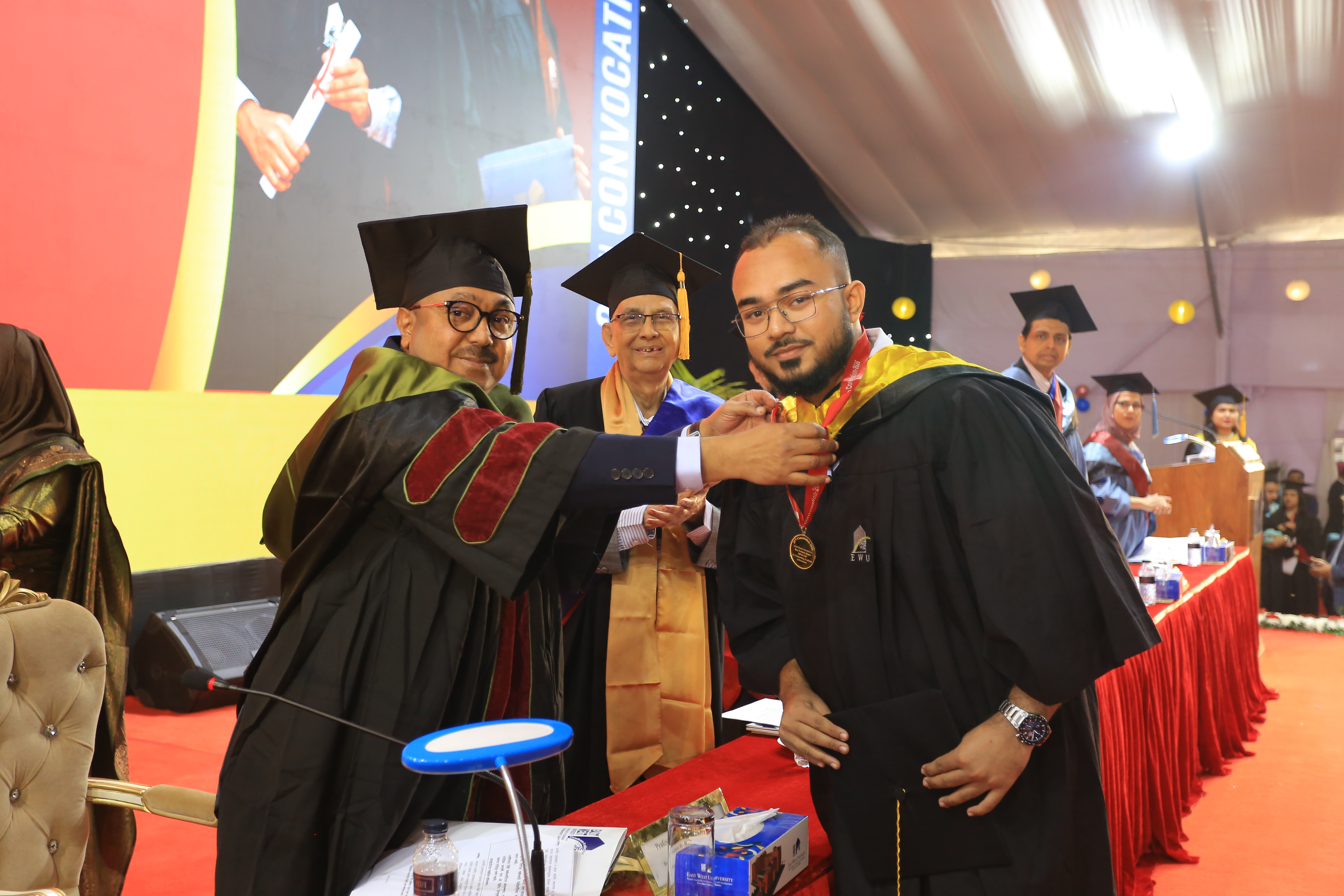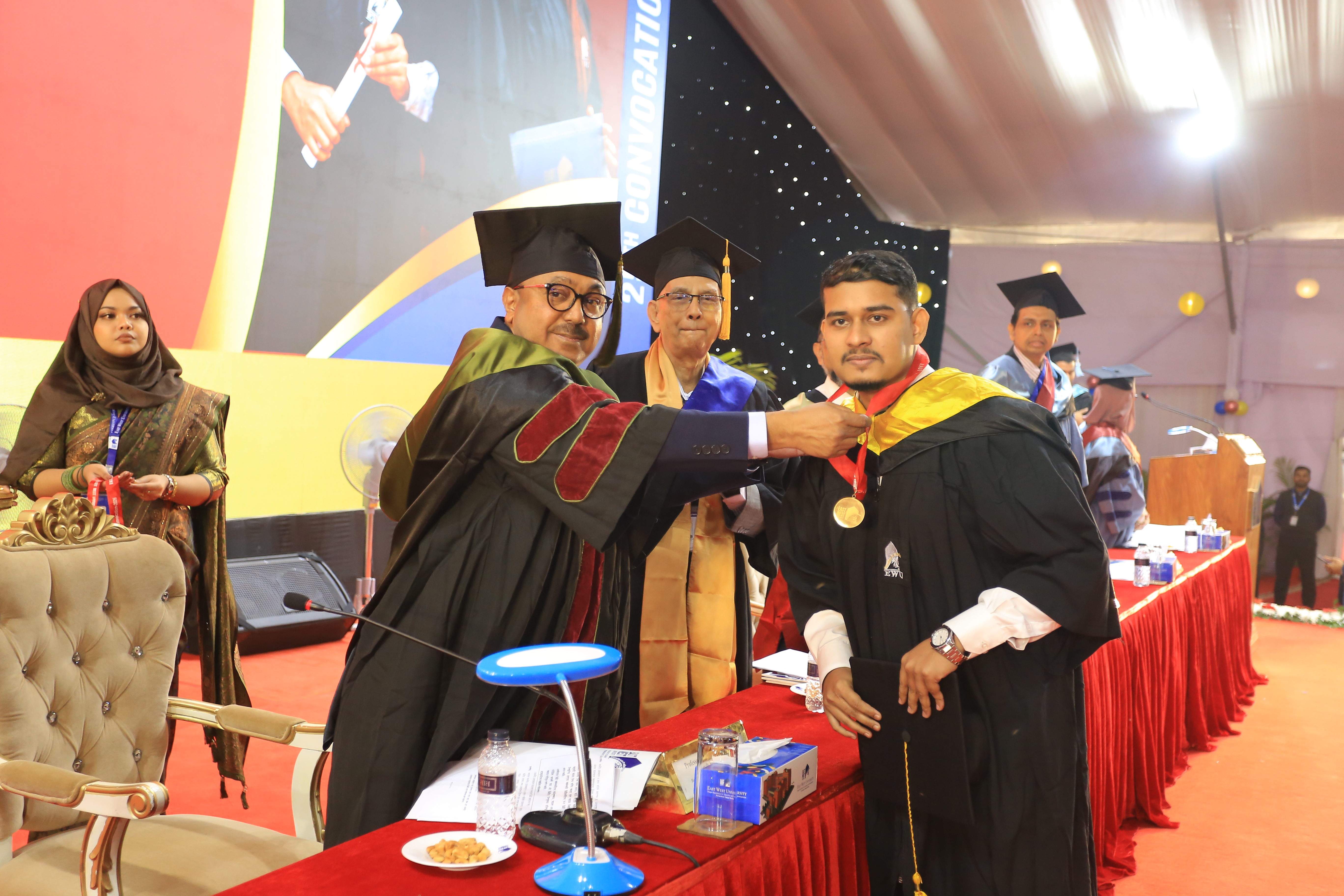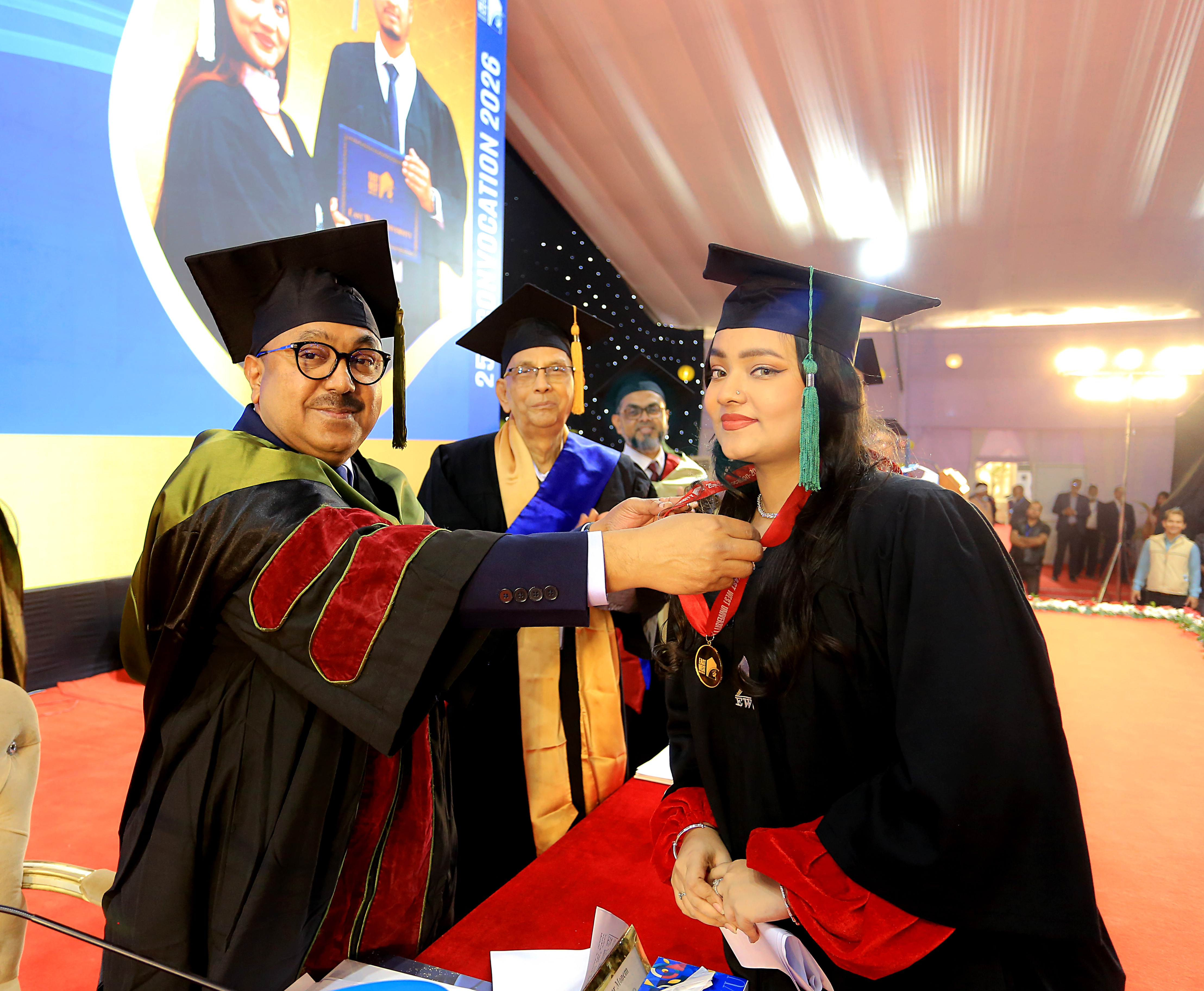 The 25th convocation of East West University (EWU) was held on 02 February 2026 (Monday) at Aftabnagar Playground in the capital. At the convocation, as the representative of His Excellency the President, the Chancellor of the university, Professor Dr. Mobasser Monem, Chairman of Bangladesh Public Service Commission (BPSC), presented degrees to the students. 1857 students of undergraduate and graduate programs were awarded certificates at this convocation. In addition, nine exceptionally meritorious students with a CGPA of 4.0 out of 4.0 were awarded gold medals.