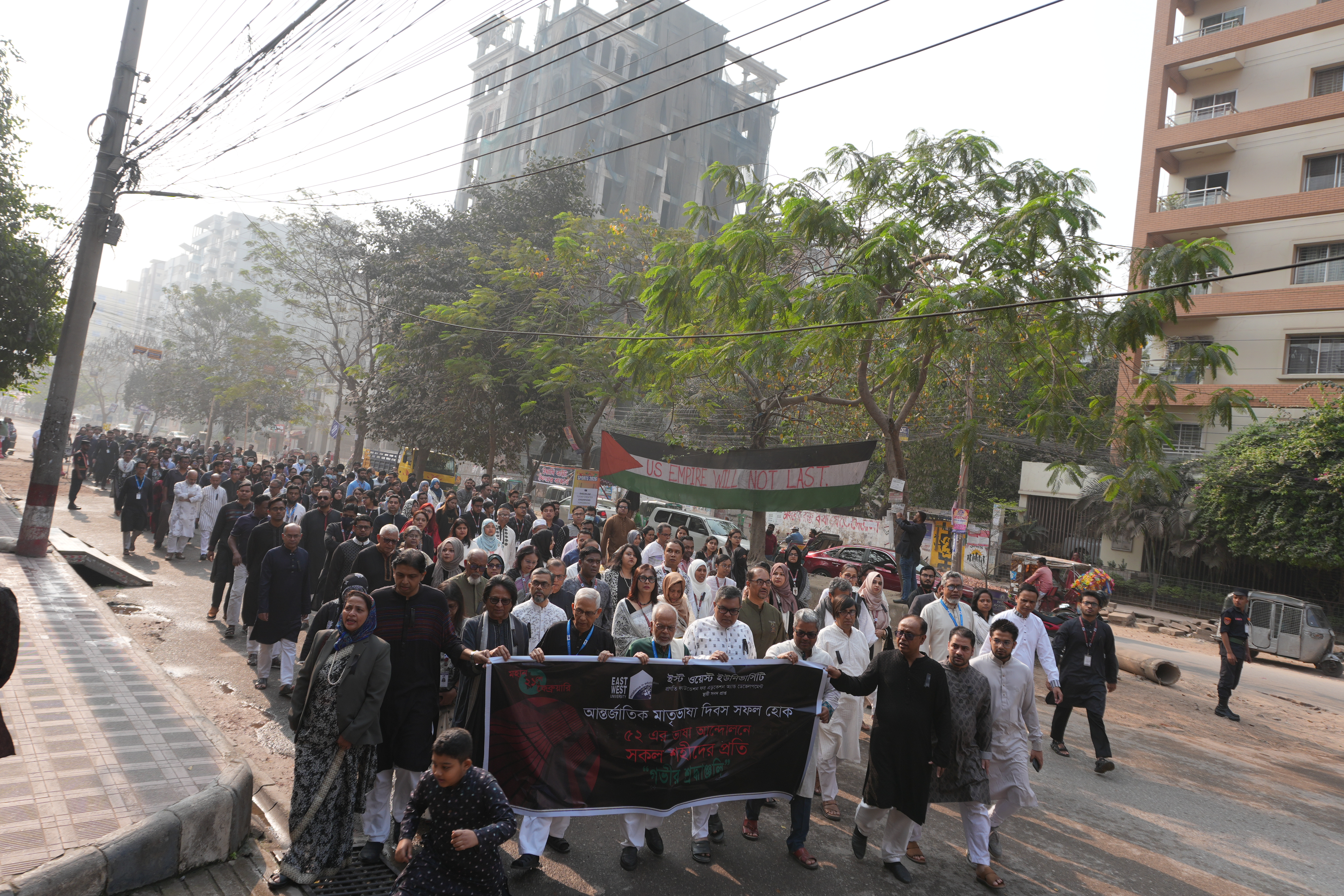 The event was graced by the presence of Professor Dr. Mohammed Farashuddin, Chairperson of the Board of Trustees and founder Vice Chancellor of EWU. He was joined by Board of Trustees members Dr. Muhammad A. Mannan, Mr. Nowshad Shamsul Arefin, and Mr. Mansoor Mumin. Also in attendance were Professor Dr. Shams Rahman, Vice Chancellor; Professor Dr. M. Ashik Mosaddik, Pro-Vice Chancellor; and Air Cdre (Retd) Ishfaq Ilahi Choudhury, Treasurer. The ceremony also saw a large gathering of Deans, the Registrar, faculty members, officials, staff, and a significant number of students, all united in their commitment to upholding the spirit of the mother tongue and the heritage of the nation.
