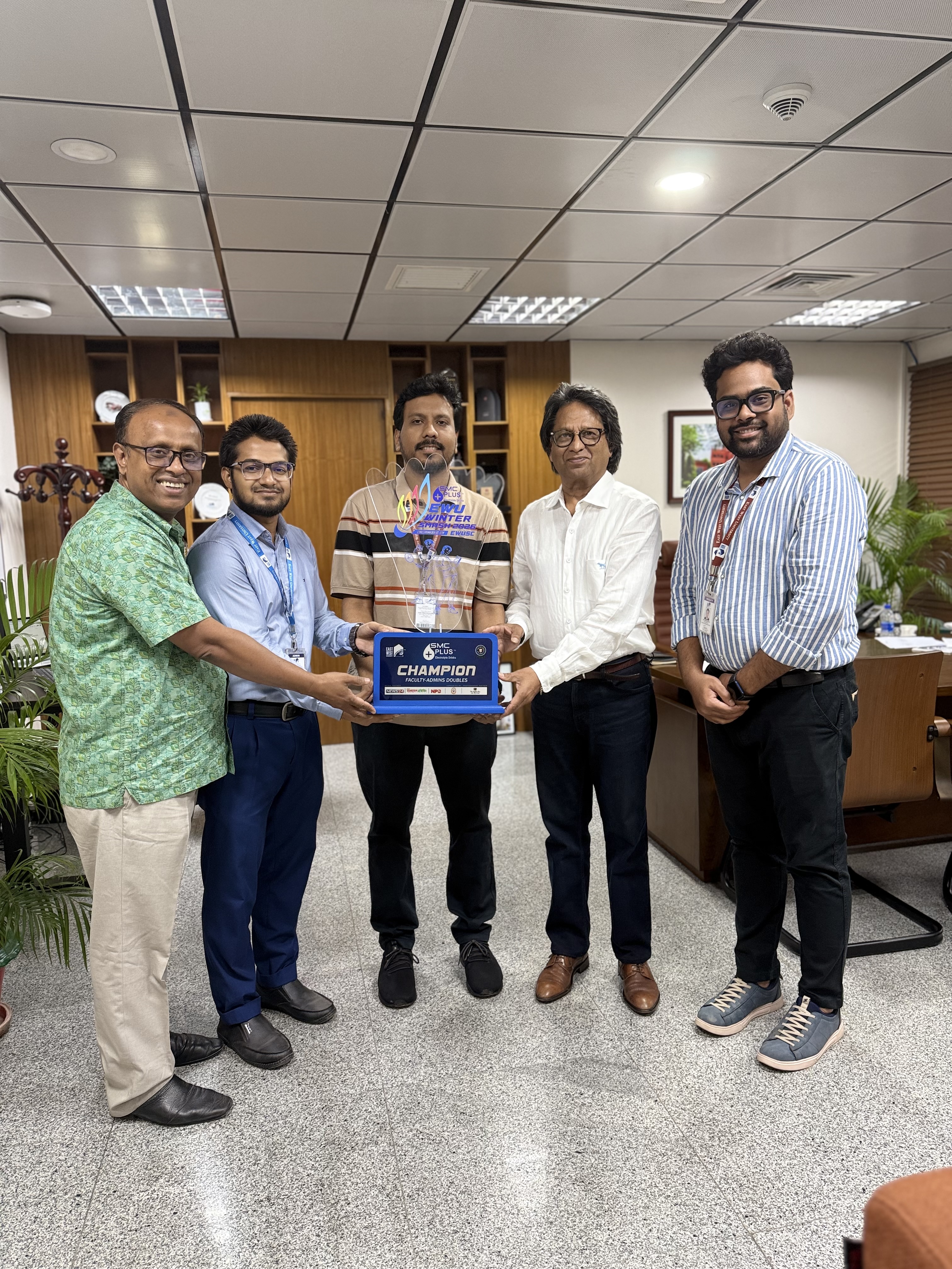 Competing against strong contenders from 43 universities, the duo emerged as Champions, securing the 1st prize in the Faculty & Admin Doubles category. Their victory not only reflected their outstanding teamwork but also highlighted Hasibur Rahman’s national-level caliber and competitive dominance on the court.